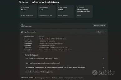 Pc assemblato con le seguenti caratteristiche: CPU: Intel i7-12700K Scheda video: NVIDIA RTX 3070 Zotac 8GB Scheda madre: ASUS ROG Maximus Z690 Hero RAM: 32GB DDR5 Corsair Vengeance RGB 6000MHz Archiviazione: SSD Samsung NVMe 500GB Alimentatore: Cooler Master 750W 80 Plus Bronze Case: NZXT H9 Flow (eccellente airflow) Dissipatore CPU: Corsair H100i a liquido Ventole: 6 ventole ARGB, tutte controllabili tramite software Corsair iCUE Sistema operativo: Windows 11 Pro originale e attivato PC potente, stabile e silenzioso, pronto all’uso, basta collegare monitor, tastiera e mouse. Disponibile per qualsiasi informazione o foto aggiuntive.
