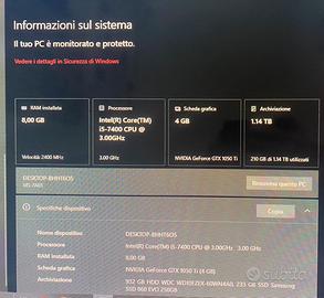 PREZZO OCCASIONE CAUSA NECESSITÀ Vendo PC fisso assemblato, ideale per uso quotidiano, studio, ufficio e gaming "entry-level" (perfetto per titoli eSports come League of Legends, Valorant, CS:GO, Minecraft o Fortnite con dettagli adeguati). Il PC è perfettamente funzionante, reattivo e pronto all'uso. Ecco le specifiche tecniche complete: • Processore (CPU): Intel Core i5-7400 (Quad-Core a 3.00 GHz) • Scheda Grafica (GPU): NVIDIA GeForce GTX 1050 Ti (4GB dedicati) - Ottima per giocare in Full HD (1080p) senza troppe pretese. • Memoria RAM: 8 GB Corsair Vengeance (2400 MHz) • Archiviazione Veloce (SSD): Samsung 860 EVO da 250 GB (Il sistema operativo si avvia in pochi secondi) • Archiviazione Dati (HDD): Western Digital Blue da 1 TB (Tantissimo spazio per giochi, foto e documenti) • Scheda Madre: MSI B250M Gaming Pro • Alimentatore: Cooler Master MasterWatt Lite 500W • Dissipatore CPU: Cooler Master a torre (mantiene il processore molto più fresco rispetto al dissipatore base) • Case: Nero con pannello laterale trasparente e ventola con illuminazione LED rossa. Il sistema unisce la velocità dell'SSD Samsung (tra i migliori sul mercato) alla grande capacità dell'Hard Disk da 1TB.