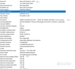 Vendesi computer Fujitsu Esprimo E5720. Sistema operativo Windows 10 Pro Core 2 E5720 RAM 8 GB SSD da 500 GB Scheda video integrata, risoluzione 1920x1080 60herz Software: Ccleaner, Adobe Acrobart Reader, LibreOffice 24.8, VLC media Player, AnyDesk, Chrome Browser. No tastiera, no mouse, no monitor