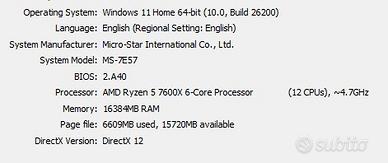 PC desktop ad alte prestazioni, ideale per gaming, lavoro professionale e streaming. Dotato di processore AMD Ryzen 5 7600X di ultima generazione con 6 core e 12 thread, capace di raggiungere frequenze superiori ai 5GHz, offre prestazioni eccellenti sia nei giochi che nelle applicazioni pesanti. Memoria RAM Corsair DDR5 da 16GB ad alta velocità, garantisce fluidità totale e multitasking senza rallentamenti. Scheda video NVIDIA GeForce RTX 2080 Super da 8GB, potente e affidabile, perfetta per giocare in 2K con ottimi FPS, supporta Ray Tracing e DLSS per una grafica realistica e prestazioni elevate. Sistema di raffreddamento a liquido che mantiene temperature basse anche sotto carico, assicurando stabilità e lunga durata dei componenti. Scheda madre MSI Gaming con WiFi integrato, compatibile con le tecnologie più recenti (DDR5, M.2) e pronta per futuri upgrade. Archiviazione combinata: SSD M.2 da 256GB per sistema operativo e giochi (massima velocità) HDD da 1TB per archiviazione di file e dati Monitor incluso AOC da 27 pollici, risoluzione 2K (2560×1440) e refresh rate di 180Hz, ideale per un’esperienza di gioco fluida, nitida e competitiva. Sistema perfettamente bilanciato, pronto all’uso, adatto a chi cerca potenza, affidabilità e prestazioni elevate. Il prezzo è negoziabile.