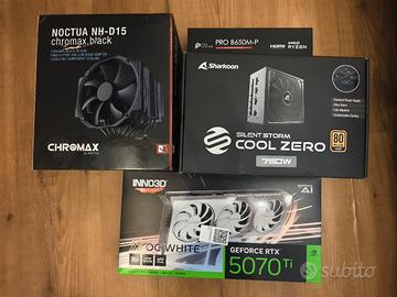 per inutilizzo vendo PC desktop gaming con i seguenti componenti: case: Asus prime ap201 microatx scheda madre: msi pro am5 b650m-p RAM: Corsair 32gb 6000mhz ddr5 cl30 dissipatore CPU: noctua nh-d15 black cpu: ryzen 7 9800x3d scheda video : rtx 5070ti 16gb inno3d X3 OC White SSD: 1tb crucial p3 con Windows pro 11 ventole thermaltake ct 120 alimentatore:Sharkoon silente storm cool zero 80 plus Gold da 750 watt tutto in perfette condizioni, PC poco ingombrante ed estremamente silenzioso ,ho le scatole dei vari componenti tranne la CPU che è stata acquistata da poco su AliExpress ed è arrivata senza scatola ,ma è in garanzia. ho la garanzia residua anche della scheda video,acquistata circa 2 mesi fa nuova su noto store. PC in grado di fare digitare a dettaglio ultra gli ultimi giochi usciti in 1440p e 4k PC sfruttato pochissimo,convinto di usarlo come pc da gaming alla fine usato come PC da ufficio. offro e pretendo massima serietà . non vendo i singoli componenti ,solo in blocco. mi riservo di togliere l'annuncio in qualsiasi momento solo consegna a mano dopo aver visionato e provato il tutto,al momento non spedisco.