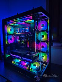 pc gaming di alta fascia con tutti i cartoni disponibili gpu. 5080 astral ssd. 9100 2T samsung cpu. ryzen 7 9800x3d mobo. x870e-e asus rog gaming wifi ram. g-skil trident 6000mhz cl 30 dissipatore. asus rog 360 liquido 12 ventole aria 120 alimentatore. 1000w corsair rm modulare case. phanteks nv7 monitor interno