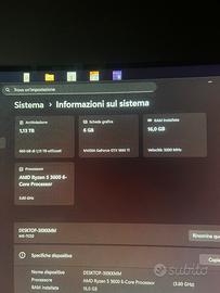 Vendo PC gaming completo perfettamente funzionante. Componenti principali: CPU: AMD Ryzen 5 3600 (6-core) GPU: NVIDIA GTX 1660 Ti 6GB RAM: 16 GB DDR4 3200 MHz SSD: 250 GB HDD: 1 TB Case: Cooler Master Scheda madre MSI Alimentatore incluso Periferiche incluse: Tastiera meccanica 2 x Mouse Corsair Volendo avrei anche un monitor 165hz da 24 pollici della AOC