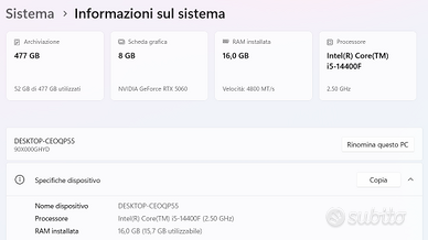 Vendo nuovissimo pc super performante di ultima generazione per inutilizzo, perfetto per gaming ai massimi dettagli Intel Core i5-14400F (10 core/16 thread, 2.5-4.7 GHz, 20MB cache). NVIDIA GeForce RTX 5060 8GB GDDR7 (supporta DLSS, ray tracing). RAM 16GB DDR5 512GB SSD NVMe PCIe 4.0 Wi-Fi 6E, Bluetooth 5.3 Windows 11 tag: windows desktop fisso pc laptop desktop nvidia gtx rtx gaming fortnite apple mac gaming cod valorant scheda video gpu