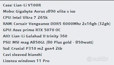 Build completamente bianca+RGB (nuovo) Case: Lian-Li V100R Mobo: Gigabyte Aorus z890 elite x ice CPU: Intel Ultra 7 265k RAM: Corsair Vengeance DDR5 6000Mhz 2×16gb (32gb) GPU: Asus prime RTX 5070 OC AIO: Lian-Li Galahad Il trinity 360 PSU: MSI mag A850GL (80 Plus gold 850watt) Ssd: Crucial P310 m2 gen4 2tb Cavi sleeved bianchi Licenza windows 11 Pro Disponibili anche tutte le scatole originali di ogni singolo pezzo Pc nuovo, assemblato e configurato pronto all'uso Valore componenti: 2500€