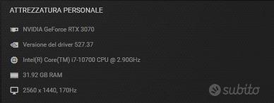 Vendo per passaggio a PC portatile, fantastico PC GAMING ROG STRIX acquistato a Marzo del 2021 presso noto rivenditore di Latina. Ideale per video editing, gaming avanzato e molto altro. Di seguito le sue caratteristiche: •Case RGB Lit 100 •Alimentatore Cooler Master Gold 750w Modulare •Scheda Madre Asus SERIE b Pro Tuf Gaming •Processore Intel Core i7 10700 @2.90GHz decima generazione •Dissipatore a liquid Asus Tug LC240RGB •Kit Ventole RGB •Ram Corsair Dissipate 16gb RGB x 4 = 32Gb •Supporto Primario 500Gb SSD •Supporto Secondario 2.000Gb HDD •Scheda Video Asus RTX 3070 8Gb Aura SYNC Oc Edition •Barra di supporto scheda grafica - RGB UpHere Per qualsiasi ulteriore informazione, non esitate a contattarmi.
