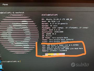 PC FISSO ben tenuto e completamente funzionante, non presenta componenti difettosi o vecchi. PC SPEC: Cpu: Ryzen 5 7600x Ram: 32Gb DDR5 Gpu: 3060 8gb vram Alimentatore: 1000W Scheda madre: msi b650 gaming plus (wifi) Memoria: 1Tb SSD Dispone di raffreddamento a liquido ( la cpu non sale sopra i 60°C a massimo sforzo ed é dotato di 4 ventole ( escludendo le 3 del raffreddamento a liquido. É una bestia per qualsiasi tipo di gioco come COD o Rainbow Six Siege e fortnite, insieme ad allenamento di intelligenze artificali.