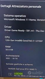 vendo per passaggio a notebook PC gaming i7 12700 con 32gb di RAM nvme 2tb alta velocità e Nvidia 3060ti. Non e più in garanzia non vendo pezzi separati non scambio con niente contattare solo se realmente interessati.Il prezzo è onesto visto quanto costano oggi RAM SSD e schede video quindi non chiedete sconti .