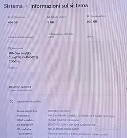 vendo pc gaming con installato windows 11 26h1 + adobe acrobat professional il pc e cosi composto Case gaming rgb ben ventilato e sinzioso Alimentatore Sharcoon 600 watt 80 plus Dissipatore rgb mar gaming raffredda fino a 140 watt + che ottimo processore Intel Core i5-11600K (11a gen, 6 core / 12 thread, 3.9GHz) Scheda madre: ASUS PRIME B560M-K Scheda video nvidia gtx 1660 super 6gb SSD NVMe Crucial 500GB Ram ddr4 corsair vegeance 2x8 16 giga 3200mhz WiFi 6 (AX1800) + Bluetooth integrati Potete tranquillamente venire a casa mia a provarlo