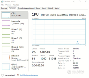 Vendo PC gaming assemblato e tenuto molto bene, usato principalmente per gaming e utilizzo normale. Il PC funziona perfettamente ed è pronto all’uso. Ideale per giocare in Full HD e 1440p con ottime prestazioni. Componenti: CPU: Intel i5 11600K (6 core / 12 thread) Scheda video: Radeon Pulse RX 6600 XT 8GB RAM: 16GB (2x8GB) XPG DDR4 Scheda madre: MSI B560 Tomahawk WiFi SSD: Samsung 970 EVO Plus NVMe 1TB HDD: 1TB Raffreddamento: Cooler Master ML240 RGB (liquido) Alimentatore: Sharkoon SilentStorm Cool Zero 650W 80+ Gold modulare Case: Sharkoon TG6 RGB con vetro temperato Caratteristiche: WiFi integrato RGB personalizzabile Sistema pulito e pronto all’uso Ottimo airflow e temperature basse PC usato circa 4 anni ma sempre tenuto con cura. Prezzo: trattabile Per qualsiasi info scrivetemi pure.