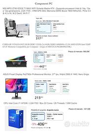 Vendo PC fisso di fascia enthusiast, assemblato con componenti premium di ultima generazione. La macchina è una belva, perfetta per il gaming in 1440p/4K a settaggi ultra, streaming, video editing pesante e rendering 3D. Silenzioso, temperature sempre sotto controllo! Ecco le specifiche tecniche nel dettaglio: • Processore (CPU): Intel Core i7-14700K (20 Cores / 28 Threads) • Scheda Video (GPU): ZOTAC RTX 4070 Super 12GB Twin Edge OC GDDR6X • Scheda Madre: MSI MPG Z790 EDGE TI MAX WIFI (Supporto DDR5, Wi-Fi 7 integrato) • Memoria RAM: CORSAIR VENGEANCE RGB DDR5 32GB (2x16GB) 6000MHz CL30 • Archiviazione (SSD): Samsung 990 PRO NVMe M.2 da 1TB • Dissipatore a liquido: ARCTIC Liquid Freezer III 240 A-RGB • Alimentatore: Corsair RM750e (2023) ATX Completamente Modulare Valore attuale di mercato : + 2778,29 Aggiungo anche Monitor ASUS ProArt Display PA278QV 27" WQHD (2560x1440) perfetto per la color correction e il gaming. Mouse e tastiera sono inclusi Il Pc senza monitor , mouse e tastiera lo vendo a 1.800 Il PC è stato appena formattato, pulito e ha Windows preinstallato, pronto all'uso. Preferisco scambio a mano zona Parma, Non accetto scambi. Prezzo leggermente trattabile.