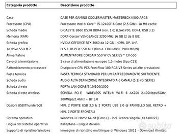 💻 PC GAMING COMPLETO – PRONTO ALL’USO Vendo PC fisso da gaming in ottime condizioni, perfettamente funzionante e pronto all’utilizzo. Ideale per giocare in Full HD ad alte prestazioni e per utilizzo lavorativo (grafica, CAD, ecc.). 🔧 Specifiche principali: - Processore: Intel i5-12400F (6 Core, ottime prestazioni) - Scheda video: NVIDIA RTX 3060 12GB - RAM: 16GB DDR4 3200MHz (Corsair Vengeance) - SSD: 1TB M.2 (velocissimo) - Scheda madre: Gigabyte B660 - WiFi 6 + Bluetooth integrati - Alimentatore: Corsair 550W - Case Cooler Master RGB - Sistema operativo: Windows 11 originale 🎮 Prestazioni gaming: Il PC permette di giocare senza problemi ai principali titoli: - Fortnite → fluido in alto/epico - Warzone / Call of Duty → medio-alto fluido - GTA V → ultra senza problemi - Minecraft → con shader senza lag - Valorant / CS2 → altissimi FPS - FIFA / EA FC → perfetto - Roblox → perfetto, grafica al massimo e fluido - Sea of Thieves → medio-alto fluido (In generale tutti i giochi girano molto bene in Full HD) ❄️ Raffreddamento efficiente con dissipatore RGB, silenzioso anche sotto carico. 📦 PC già assemblato, testato e pronto all’uso. Basta collegarlo e giocare. 💰 Prezzo: 700€ (trattabile) 📍 Consegna a mano zona cinisello balsamo/cusano milanino, no spedione. Contattami per info o altre foto.