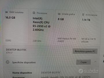 Prezzo trattabile Vendo PC Desktop da Gaming appena assemblato, configurato e testato professionalmente. La macchina è un mix perfetto tra eleganza (case bianco compatto) e prestazioni, ideale per giocare in Full HD ai titoli più popolari come Fortnite, Valorant, GTA V, Minecraft e Warzone. Il PC viene consegnato con le scatole originali dei componenti e il sistema operativo Windows 10 Pro già attivo in toscana. SPECIFICHE TECNICHE: SCHEDA VIDEO: AMD Radeon RX 580 (Versione 8GB VRAM) – NUOVA. Prestazioni solide in Full HD per tutti i titoli moderni. PROCESSORE: Intel 3.00 ghz (8 Core / 16 Threads). Una CPU di derivazione workstation, perfetta per gestire contemporaneamente gioco, Discord e streaming senza rallentamenti. SCHEDA MADRE: Machinist X79 – NUOVA. Affidabile, con supporto audio HD frontale e posteriore. MEMORIA RAM: 16 GB DDR3 Dual Channel – NUOVA. Multitasking fluido e caricamenti rapidi. ALIMENTATORE: Corsair 550W 80+ Bronze. Componente di fascia alta che garantisce massima protezione contro sbalzi di tensione e massima efficienza energetica. STORAGE IBRIDO (1.25 TB totali): SSD Samsung 256GB: Per un avvio di Windows istantaneo e un sistema sempre reattivo. HDD Seagate BarraCuda 1TB (7200 RPM): Ampio spazio per archiviare tutti i tuoi giochi (Testato e garantito con CrystalDiskInfo). CASE: Mars Gaming Micro-ATX Bianco. Design moderno e compatto, ideale per ogni setup. Driver aggiornati all'ultima versione disponibile. Regge stress test perfettamente e temperature sempre sotto i 60 gradi. PERIFERICHE E MONITOR NON IN VENDITA.