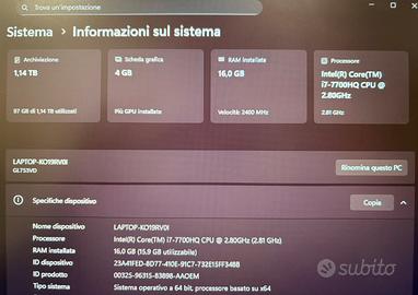 Vendo pc portatile WINDOWS 11 ASUS in ottime condizioni, perfettamente funzionante e pronto all’uso. Ideale per gaming leggero (Fortnite, GTA, Warzone), studio e lavoro. OLTRE al PC Regalo anche uno zaino OMEN DELL’HP bello robusto con tante tasche. un mouse RGB (IL PC è stato riavviato alle impostazioni di fabbrica pronto all’uso) ⚠️⚠️⚠️PER ALTRE FOTO E FOTO AGLI ACCESSORI IN PRIVATO!!!! 🔧 Specifiche: •Processore Intel i7-7700HQ (2.80GHz) •Scheda video GTX 1050 4GB •RAM 16GB •SSD 240GB (veloce) •HDD 1TB (spazio per tutto) 💻 Il pc è veloce, fluido e non necessita di alcun intervento. 🎮 Incluso nel prezzo: •Zaino HP Omen originale •Mouse RGB Nuovo 📌 Condizioni: Batteria + Mouse + Pc + Zaino in condizioni impeccabili. RITIRO SOLO A MANO, NO PERDITEMPO!!!