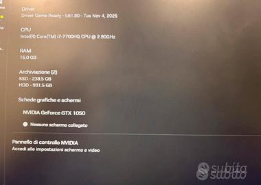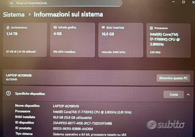 Vendo pc portatile WINDOWS 11 ASUS in ottime condizioni, perfettamente funzionante e pronto all’uso. Ideale per gaming leggero (Fortnite, GTA, Warzone), studio e lavoro. OLTRE al PC Regalo anche uno zaino OMEN DELL’HP bello robusto con tante tasche. un mouse RGB (IL PC è stato riavviato alle impostazioni di fabbrica pronto all’uso) ⚠️⚠️⚠️PER ALTRE FOTO E FOTO AGLI ACCESSORI IN PRIVATO!!!! 🔧 Specifiche: •Processore Intel i7-7700HQ (2.80GHz) •Scheda video GTX 1050 4GB •RAM 16GB •SSD 240GB (veloce) •HDD 1TB (spazio per tutto) 💻 Il pc è veloce, fluido e non necessita di alcun intervento. 🎮 Incluso nel prezzo: •Zaino HP Omen originale •Mouse RGB Nuovo 📌 Condizioni: Batteria + Mouse + Pc + Zaino in condizioni impeccabili. RITIRO SOLO A MANO, NO PERDITEMPO!!!