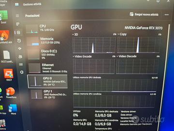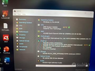 Vendesi pc da gaming con le seguenti specifiche: * Processore amd ryzen 5 5600g 6core 12threads 3.90ghz fino a 4.40ghz con turbo boost * Ram 16gb ddr4 2x8gb 3200mhz * Ssd 1tb nvme m.2 * Scheda madre MSI x470 gaming pro carbon * Scheda Video NVIDIA GeForce RTX 3070 8gb zotac twin edge * Case Empire Gaming con pannello laterale in vetro temperato e 5 ventole in totale argb comandabili dal telecomando * Raffreddamento a liquido Thermalright 240mm * Alimentatore Unyka 750w 80 plus Bronze * Windows 11 Pro con licenza originale * Microsoft office 2021 attivo il pc è stato formatato con installazione pulita del Windows ed è pronto al uso per qualsiasi domanda o informazione contattatemi