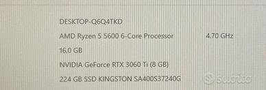 Vendo computer, PC da gaming/lavoro di grafica con le seguenti componenti: Ryzen 5 5600 RTX 3060 Ti 8gb Ram DDR4 16GB 3200MHz Crucial Ballistix Sport LT Scheda madre Asus B450M-A II Alimentatore Riotoro 600w Raffreddamento a liquido Be quiet Pure Loop 2 Case DeepCool con 3 ventole con controller personale Thermalright e una ventola posteriore Artic SSD Kingstone 224gb Modulo WiFi 6 e bluetooth sulla Pcie in più ci sono un supporto per la GPU e uno schermino usb interno che con l’apposito programma permette la visualizzazione delle temperature e alcuni dati, moddabile dal programma. Presente pure una striscia led all’interno. Per altre foto o info contattatemi, disponibile prova sul posto VENDO SOLO DI PERSONA, ZONA CITTÀ DI CASTELLO (Pg)