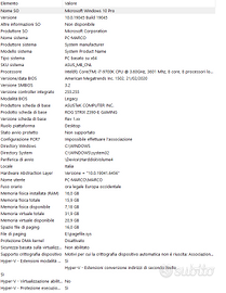 VENDO PER INUTILIZZO IL MIO PC DA GAMING CON I SEGUENTI COMPONENTI: SCHEDA MADRE: ASUS ROG STRIX Z390-E GAMING (AURA SYNC/WIFI/DOPPIO M.2/USB 3.1) CPU: INTEL CORE i7 9700K sempre utilizzata a 4.5 GHz per il gaming, anche attuale, bastano e avanzano RAM: 16 GB G.SKILL TRIDENT Z RGB 3200 MHz CL14-14-14-34 135V SCHEDA VIDEO: RTX 5080 SUPRIM LIQUID SOC 16 GB VRAM COOLING/VENTILAZIONE: 6 VENTOLE CORSAIR LL 120 RGB DUAL LIGHT LOOP PWM con relativo controllore lighting node pro che permette la personalizzazione di velocità ed effetti di ogni singnola ventola tramite software iCue corsair NZXT KRAKEN X73 360MM CON RELATIVE VENTOLE (ne consiglio la sostituzione. Fa ancora il suo dovere, sopratutto nel gaming dove la cpu non ha grandi sforzi, ma ho notato un innalzamento delle temperature rispetto a quando nuovo) OVVIAMENTE C' E IL RADIATORE DA 360 INTEGRATO DELLA GPU ARCHIVIAZIONE: SAMSUNG 970 EVO PLUS SSD M.2 DA 250 GB SAMSUNG 860 EVO SSD SATA 2.5" 1 TB SEAGATE BARRACUDA 4TB HDD ALIMENTATORE: CORSAIR HX850 80PLUS PLATINUM COMPLETAMENTE MODULARE CASE: LIAN LI O11 DYNAMIC MID TOWER NERO a cui ho maldestramente rotto il vetro piccolo anteriore mentre stavo pulendo il pc con aria compressa LA BUILD DI BASE E' DI GENNAIO 2021, A CUI SONO SUCCESSIVAMENTE STATI AGGIORATI SISTEMA DI VENTILAZIONE CORSAIR UN ANNO DOPO E GPU NEL 2025 IL PREZZO E’ RIFERITO AL PC COMPLETO RITIRATO A MANO, SE VOLETE SOLO LA SCHEDA VIDEO IL PREZZO COMPRESA SPEDIZIONE E’ LO STESSO DEL PC RITIRATO A MANO (UNA VOLTA VENDUTA QUELLA NON CI FACCIO NIENTE DI UN PC VECCHIO A PEZZI) OVVIAMENTE E' PERFETTAMENTE FUNZIONANTE SENZA ALCUN PROBLEMA! RIMANGO A DISPOSIZIONE PER QUALSIASI DOMANDA