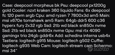 Vendo pc gaming custom assemblato da una ditta di torino a maggio 2024, nelle foto trovate tutta la descrizione dei componenti montati. Vendo con schermo mouse e tastiera, pronto per giocare o stremmare. per info e foto contattatemi