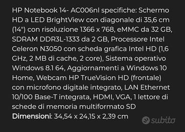 HP Notebook 14- AC006nl specifiche: Schermo HD a LED BrightView con diagonale di 35,6 cm (14") con risoluzione 1366 x 768, eMMC da 32 GB, SDRAM DDR3L-1333 da 2 GB, Processore Intel Celeron [...]