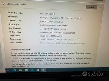 Come da titolo vendo PC modello HP ProDesk EIJA9H8 Processore i5-4570 CPU 3.20GHz RAM 8.00 GB Archiviazione 250 GB SSD ATA Scheda grafica INTEL HD 4600 (113MB) Per altre info contattatemi