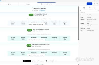 Vendo PC fisso completo, veloce e pronto all’uso, adatto a lavoro, studio e utilizzo quotidiano, con scheda video dedicata. Configurazione: Intel Core i5-10400 (6 core) 32 GB RAM DDR4 SSD NVMe 500 GB + secondo disco 512 GB NVIDIA GTX 960 ASUS 2gb Scheda madre ASRock B460M-HDV Alimentatore Xilence 700W Dissipatore Arctic Alpine 12 Lettore/masterizzatore DVD lettore SD card Windows 11 pro attivo con licenza Manutenzione eseguita: Pulizia completa interna ed esterna Pasta termica CPU sostituita Sistema installato e aggiornato PC testato (benchmark eseguiti, vedi foto), stabile e reattivo. Ideale per: ufficio, smart working, navigazione, Office, multimedia e gaming leggero.