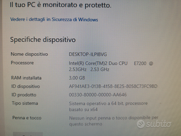 Processore Intel Core 2 Duo E7200 3Gb memoria ram 120Gb disco SSD Masterizzatore DVD Scheda video Intel G33 separata Windows 10 Professional installato (da attivare con licenza)