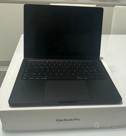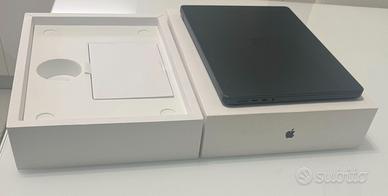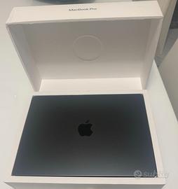 Pc Mac Book Pro 14 pollici, nero siderale, Ram 16 GB di memoria, archiviazione SSD 512 GB, acquistato su Apple Store a maggio 2025, coperto da garanzia fino a maggio 2027. Usato pochissimo solo 7 cicli di batteria. Come si vede dalle foto è tenuto benissimo dato il poco utilizzo, solo due piccoli graffi quasi impercettibili sull'angolo del coperchio che ho evidenziato con un cerchio blu nella foto allegata