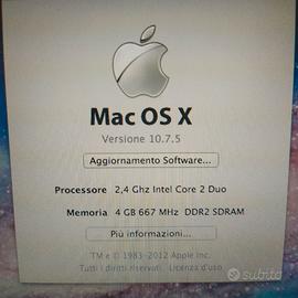 Vendo Apple Macbook A1181 versione nera, appena formattato e istallato Mac OS X Lion, schermo 13.3 pollici , CPU intel core 2 duo da 2,4GHz , disco da 320GB e RAM 4GB. Batteria tiene ancora carica , vendo con suo alimentatore originale