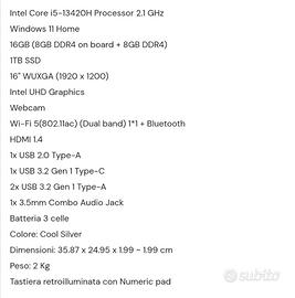 Asus 16" Vivobook 16 X1605VA-MB2011W nuovo, super prezzo, a soli 500 euro.
