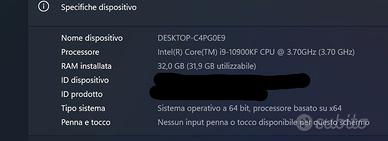 Case Cooler Master Masterbox Q300L 50 Radiatore a 2 ventole Cooler Master MasterLiquid ML240L RGB Scheda Madre ROG STRIX B560-G GAMING WIFI Scheda Video Geforce RTX 2060 Processore i9 10900KF RAM G.Skill 32GB DDR4 RGB (8x4) Alimentatore Ho utilizzato questo pc per post produzione di fotografia e video editati in 4K. Potete guardare i lavori pubblicati sul canale YouTube al canale DAVIDPFILMS. Come giochi ho provato Ace Combat e Call Od Duty e non ho riscontrato problemi. Regalo Altoparlanti Mars Gaming MS22W 2.2 RGB Flow con subwoofer da 35 W Per qualsiasi informazione non esitate a chiedere