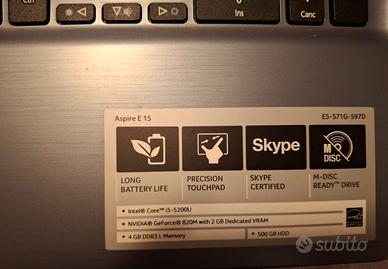 Vendo causa inutilizzo pc portatile ACER Aspire E 15 modello E5-571G-597D acquistato in data 4 luglio 2015, descrizione processore, scheda video e memoria come da foto, includo alimentatore. È stato eseguito il ripristino alle impostazioni di fabbrica di Windows 10, è funzionante, solo un po lento all'avvio, circa un minuto. Non do garanzie.