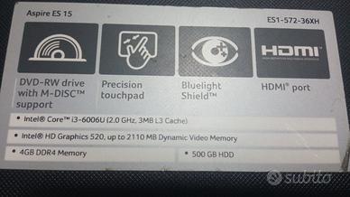 Vendesi PC portatile ACER Aspire ES 1 572- 36 XH, Core i 3 di sesta generazione 6006U, 2 GH 2, 4 GB tipo di RAM DDR4, hard disc 500 GB, retro illuminazione a Led, collegamento Wi-Fi, Bluetooth, fotocamera frontale, microfono e altoparlanti incorporati,DVD, porta HDMI, porte USB, sistema operativo Windows 10, alimentatore. ( vedi foto).