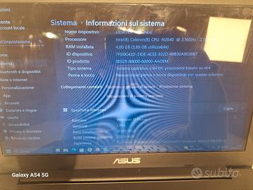 vendo portatile sprovvisto di batteria funzionante con cavo di alimentazione Modello ASUS - 95JUN32 Processore intel celeron CPU 2840 Ram installata 4,00 GB Sistema operativo a 64 bit windows 11 Home