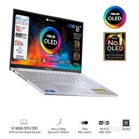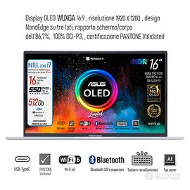 ✅ Caratteristiche principali : New Asus vivobook OLED , ✔Cpu Intel I7 13620H 10Core fino a 4.9 Ghz frequenza base 1.6 GHz✔Ram 16 Gb DDR4 3200MHz ✔SSD M.2 Pci Nvme da 512Gb, ✔Display Asus Lumina OLED pantone valitated 100% DCI-P3 risoluzione FHD+ da 16" ,Svga Ultra HD 1920x 1200 , ✔4 usb di cui 1 type C, Web Cam a colori HD, Hdmi, Wi_fi 6 , Bluetooth 5.3, ✔Top Cover Alluminio, tastiera qwerty Italiana retroilluminata a ✔3 livelli di retroilluminazione.