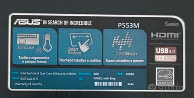 Vendo laptop Asus P553M in buone condizioni generali e perfettamente funzionante, ideale per navigazione web, email, pacchetto Office, studio e utilizzo quotidiano leggero.