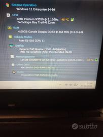 Vendo ottimo pc portatile casa/ufficio da 15,5 pollici completo di windows 11 64 bit programmi e pacchetto office 2013 - scheda madre Acer E1_510 - CPU Intel Pentium N3520 da 2,40ghz (quad core) - 4gb ram ddr3 - SSD 120gb - scheda video Integrata Intel Hd - caricabatteria - wifi - webcam - masterizzatore dvd - batteria guasta....per informazioni sono disponibile al cellulare o whatsapp 3405226737 grazie