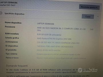 Vendo notebook Lenovo IdeaPad S145-15AST in buone condizioni e perfettamente funzionante, ideale per utilizzo quotidiano: navigazione web, pacchetto Office, streaming, smart working e studio. Caratteristiche principali: - Schermo: 15.6” - Processore: AMD A6-9225 (2.60 GHz) - RAM: 8 GB - Scheda grafica: AMD Radeon R4 - Archiviazione: SSD 256 GB (veloce e reattivo) - Sistema operativo: Windows 64 bit Condizioni: - Funzionamento perfetto - Normali segni di utilizzo (vedi foto) - Batteria funzionante Incluso: - Notebook - Caricatore originale