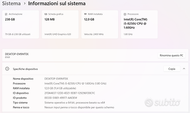 PC portatile Lenovo V330 Processore Intel i5 8^ gen. 12 GB RAM 240 GB SSD Windows 11 Pro con licenza originale e attiva Schermo 15,6" FHD Caricabatterie originale Lettore CD/DVD (può essere sostituito con alloggiamento per secondo SSD) Batteria funzionante ma con autonomia ridotta (1,5 ore di utilizzo lavoro ufficio)