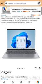Vendo computer Notebook Lenovo ThinkBook UltraSlim, modello 16” G7 ARP con potente processore Ryzen 5 7535Hs, come si vede bene le foto parlano da sole Nuovo senza un minimo segno. Completo di alimentatore originale Batteria originale durata 7-8ore a seconda dell’uso Tutto originale Lenovo caratteristiche: Scocca completa in alluminio Tastiera retroilluminata Scansione delle impronte digitali processore: AMD Ryzen 5 7535HS ad alte prestazioni 3.30Ghz di base con funzione turbo 4.55Ghz. Cache da 16MB. Ram: 16GB DDR5 4800MT/S espandibile a 64GB Disco archiviazione: SSD 512GB Nvme M.2Gen4 veloce + Slot per secondo disco espandibile Scheda Video:AMD Radeon VEGA 660M Graphics con Grafica Dedicata GDDR5 (prestazioni grafiche più veloci) per videogiochi, video editing, gaming, AutoCad, programmi ecc.. Display: LED Antiriflesso 16.0" Pollici FullHD 1920x1080P Bluetooth integrato Web-cam 1080p HD Usb-A, USB-C 2 porte Type-C con trasferimento dati ultraveloce, Hotspot mobile, Ethernet Lan, Wi-Fi, HDMI- 2 porte USB 3.0, Aux, SD card. Sistema Windows 11 Home Aggiornato con tutti i programmi base 2026, pronto all'uso con pacchetto Office Word incluso. è un potente notebook progettato per applicazioni professionali e multitasking. adatto per:👇 • Videoconferenze e Smart Working • Lavori d'ufficio e produttività • Grafica e creatività 3D • Adatto al Gaming e emulatori di console Disponibile consegna a mano o spedizione a carico acquirente con garanzia tuttosubito.it Acquistato nuovo al valore di oltre 900€ Contattare se interessati lascio il numero.. Tag: Notebook, Laptop, PC, Computer, Computer gaming, Computer portatile, i3,i5,i7, AMD, Ryzen, SSD, Asus, Hp, Samsung, Lenovo, Acer, Dell.