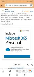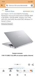 acer Aspire 1 A115-32-C56R PC Portatile, Notebook, Processore Intel Celeron N4500, RAM 4 GB DDR4, 128 GB eMMC, Display 15.6" FHD LED LCD, Intel UHD, Microsoft 365, Windows 11 Home S, Silver