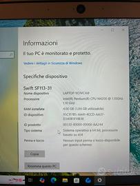 Vendo PC PORTATILE ACER con alimentatore originale per inutilizzo. Funzionante, unico segno usura sulla scocca come evidenziato unfoto. In foto sono allegate tutte le proprietà
