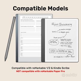 NUOVA ANCORA SIGILLATA Penna stilo di alta precisione compatibile con reMarkable 1 2 e Kindle , perfetta per sostituire la penna originale. Caratteristiche principali:4096 livelli di pressione per una scrittura naturale e fluida Rilevamento dell’inclinazione (tilt detection) Rifiuto del palmo (palm rejection) – appoggia la mano senza problemi Gomma integrata sul retro per cancellare facilmente Attacco magnetico sul tablet (si attacca saldamente come l’originale) Include 5 punte di ricambio!