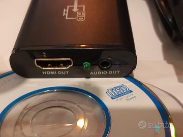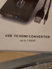 ADATTATORE VIDEO PER PC A TV PER VISULIZZARE IL PROPRIO PC ORDINARIO SU FONTE VISIVA HDMI TV HAuna semplice connessione da usb più yect spinotto audio da connettere al pc e dal congegno ne esce segnale par monitor tv in HDMI SEMPLICE E FUNZIONALE .ADATTATORE IN SCATOLA ORIGINALE CON MANUALE E IL CD ISTALLAZIONE IN CINFEZUONE ORIGUNALE APERTA PER DIMOSTRAZIINE DEL CONTENUTO GRAZIE PER INTERESSATI NO PERDITEMPO.
