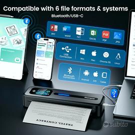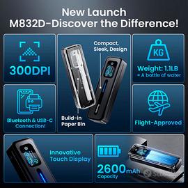 Phomemo M832D Stampante Termica Portatile A4, Stampante Termica Con Schermo Tattile Senza Inchiostro per Casa e Ufficio, Stampanti Mobili Con Custodia per il Trasporto e 3 Rotoli di Carta Termica NUOVO MAI USATO LISTINO 150€ [Tastiera tattile intelligente] Phomemo M832D Stampante Termica A4 offre funzionalità che ti consentono di controllare facilmente lo stato della batteria, lo stato della connessione e la posizione del materiale nel vassoio della carta. Puoi accedere in qualsiasi momento alla guida utente, alle istruzioni operative e alle FAQ. Offre inoltre sfondi personalizzabili, tempi di spegnimento configurabili, calibrazione del vassoio della carta e regolazione della luminosità. Grazie a un nuovo chip, la velocità di connessione Bluetooth è migliorata del 50% in termini di tempi di risposta e stabilità, mentre il rumore di stampa è diminuito del 30%, rendendola ideale per viaggi d'affari e studio [Portatile & Compatta] Phomemo M832D Stampante Termica è un compagno di viaggio senza inchiostro. Pesando 690 g (1,5 lb) e con dimensioni di 26,4×7,8×4,5 cm, il suo design compatto è paragonabile alla portabilità di un ombrello. La stampante portatile M832D è dotata di una batteria da 2600 mAh, che offre fino a 30 ore di standby. Una carica completa consente di stampare 200 fogli di carta termica, permettendo la stampa all'aperto comoda in qualsiasi momento e ovunque [Compatibile con più dispositivi e sistemi] Phomemo M832D Stampante Termica supporta connessioni Bluetooth e USB, adattandosi a vari scenari d'uso. Per smartphone e tablet, scarica la nostra app "Phomemo" e scegli Bluetooth (compatibile con iOS e Android). Laptop e desktop possono connettersi via USB-C, con compatibilità di sistema per Windows (x86 & ARM), macOS, Chrome OS e Linux [Senza inchiostro & Termico] Phomemo M832D Stampante Termica Portatile A4 utilizza tecnologia di stampa termica avanzata, eliminando cartucce e nastri di inchiostro, evitando macchie e disordine d'inchiostro. Inoltre, è com