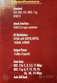 In vendita PLANET 802.11b-g WIRELESS USB ADAPTER ADATTATORE INTERNET WI-FI, in confezione originale, completa di cd rom e libretto . Caratteristiche tecniche visibili in foto.