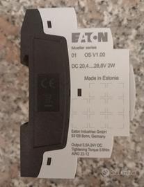 PLC Eaton (Moeller) Easy-E4-DC-12TC1, versione V1.00, alimentazione 24VDC, 8 ingressi digitali (di cui 4 configurabili come analogici), 4 uscite a transistor, porta RJ45 per programmazione attraverso cavo LAN.