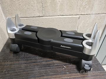 Vendo supporto per CPU/distruggi documenti Office Suites di Fellowes color nero/argento. Posiziona la CPU o il distruggi documenti sotto o accanto alla scrivania per guadagnare spazio, senza compromettere l'accessibilità. Il supporto è totalmente regolabile per larghezze differenti da 74mm a 245/285mm, e la resistente struttura in materiale plastico antiurto sopporta un peso fino a 50 kg. Presenta 4 rotelle rotanti a 360°, di cui 2 con sistema bloccante, e 2 gommini antiscivolo su ogni braccio. La CPU verrà alzata da terra di 120mm e potrà essere spostata a proprio piacimento. Misure del supporto chiuso: (L) 410mm x (P) 120mm x (A) 182mm peso 1kg circa. Supporto utilizzato per 5 mesi, in ottime condizioni, ma non dispongo della confezione.