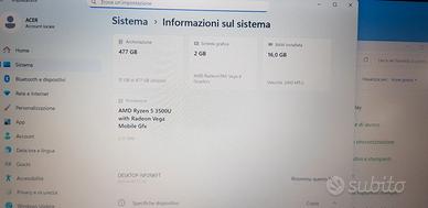 Portatile Acer Ryzen5 m2 512 ram 16giga Modello Aspire N16C1 cpuamd ryzen 5 3500U 2,10ghz turbo speed 3,70ghz ram 16 giga ddr4 2,40mhz ssd M2 512 giga scheda video amd vega 8 graphics 2giga ddr4 dx12 display full hd 15,6 led 1920x1080 webcam wifi 5ghz Bluetooth HDMI batteria buona Windows 11 home ricondizionato prezzo 160 euro