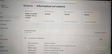 Portatile Dell i5 QHD ddr4 touch screen Modello Latitude 7480 cpu intel core i5 6300u 2,50ghz turbost 3,00ghz ram 8 giga ddr4 2133mhz ssd m2 da 250 giga scheda video intel hd 520 display 14 QHD pollici touch screen risoluzione 2560X1440 wifi 5ghz webcam HDMI Bluetooth usb 3.0 1tipoC lettore microsd tastiera retroilluminata unica pecca batteria guasta funziona con il suo carica batteria originale dato in dotazione ricondizionato Windows 11 home prezzo 90 euro (NON TRATTABILI!!)